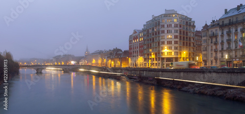 Naklejka premium Cityscape of Grenoble with Isere river at winter twilight