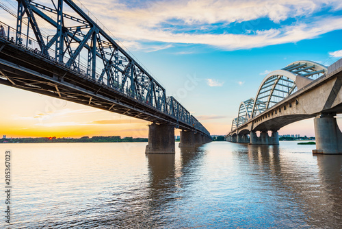 © aphotostory, Fototapeta premium Cityscape of Harbin. Harbin Songhua River Railway Bridge. Located in Harbin, Heilongjiang, China.