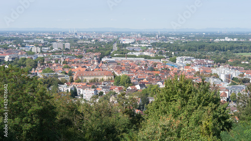 © tina7si, Fototapeta premium Cityscape of Karlsruhe - Durlach, panoramic aerial view from the „Turmberg“ (means: tower hill) in times of Coronavirus pandemic