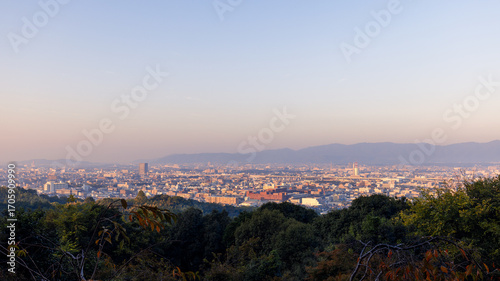 © Artem, Fototapeta premium Cityscape of Kyoto seen from Yotsutsuji Intersection trail on Mount Inari, with foreground trees, layered urban skyline and distant mountains at sunrise