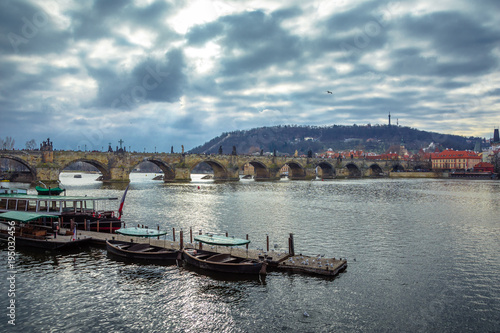 Obraz premium Cityscape of Prague with Charles bridge, medieval towers and colorful...