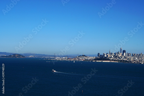 Naklejka premium Cityscape of San Francisco downtown and blue pacific ocean on sunny day , California, United states , USA - seen from fort baker , travel and sightseeing concept