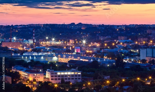 © Алексей Мараховец, Naklejka premium Cityscape of Smolensk in the evening: lit up street lamps among buildings and houses and cloudy pink sky over it in Russia.