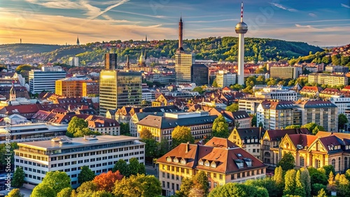 Naklejka premium Cityscape of Stuttgart with iconic landmarks and modern architecture,...