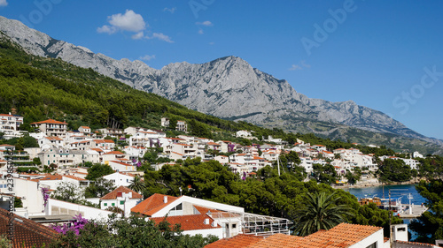 © Gabriel, Fototapeta premium Cityscape of the beautiful Croatian town, Brela situated on the Dalmatian Coast at the base of the Biokovo mountain. Charming village at the Adriatic Sea.