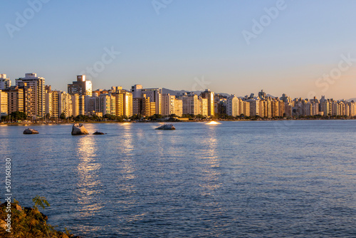 © Fernando Calmon, Obraz premium Cityscape of the Florianopolis city at sunset in southern Brazil. Boardwalk by the sea. Landscape. Nature.