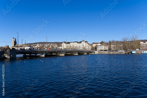 © Michael Derrer Fuchs, Naklejka premium Cityscape of the old town of Zürich with lake Zürich in the foreground on a sunny winter day. Photo taken February 5th, 2022, Zurich, Switzerland.