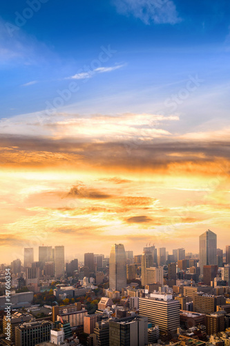 © lukyeee_nuttawut, Fototapeta premium Cityscape of Tokyo, city aerial skyscraper view of office building and downtown of tokyo with sunset / sun rise background. Japan, Asia