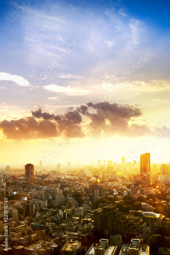 © lukyeee_nuttawut, Fototapeta premium cityscape of tokyo city sunset skyline in Aerial view with skyscraper, modern business office building with yellow gold sky background in Tokyo metropolis city, Japan.