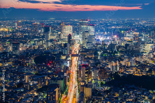 © tanarch, Fototapeta premium Cityscape of Tokyo skyline, panorama aerial skyscrapers view of office building and downtown in Tokyo in the evening. Japan, Asia.