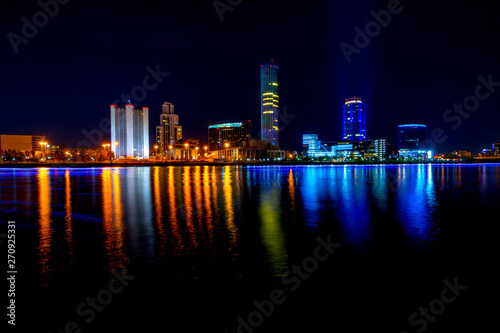 Naklejka premium Cityscape of Yekaterinburg, Russia at night with lights reflections on water