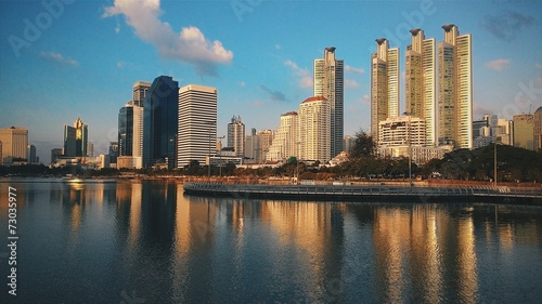 © panya7, Obraz premium Cityscape, Office buildings and apartments in Thailand at dusk.