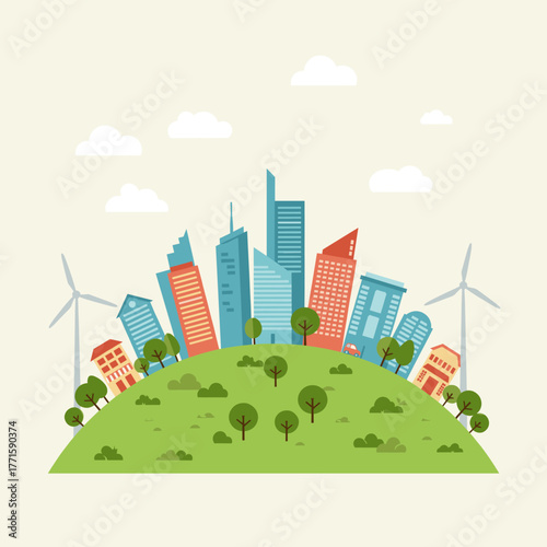 © sutiah-art, Fototapeta premium Cityscape on green hill with wind turbines and clouds in the sky.