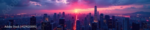 © Chontima, Fototapeta premium Cityscape panorama, twilight hues, skyscrapers, night, blue hour, sunset