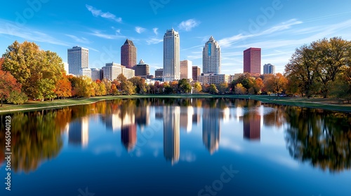Obraz premium Cityscape Reflected in Calm Lake with Autumn Trees and Clear Sky