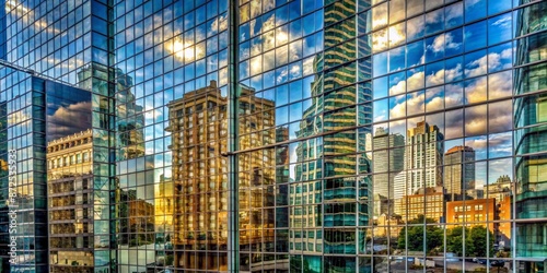 Fototapeta premium Cityscape Reflected in Glass Facade - Urban Architecture, Skyscrapers, Modern, Glass, Building