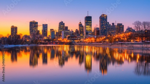 Naklejka premium Cityscape Reflection at Sunset with Colorful Sky and River