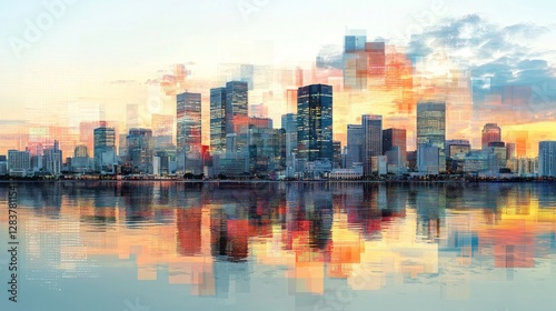 © Anisa, Fototapeta premium Cityscape reflection on water presents modern urban architecture scene