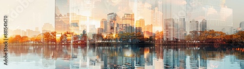 Naklejka premium Cityscape Reflections - A breathtaking view of a modern cityscape reflected in the tranquil waters of a lake. The buildings stand tall and proud, their reflections creating a mesmerizing double image