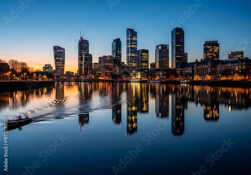 © Supardi, Obraz premium Cityscape reflections on the river at dusk, illuminated buildings skyline