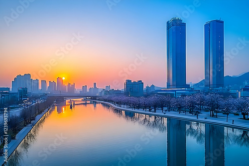 Naklejka premium Cityscape Reflects in Calm River at Sunrise with Modern Towers and Cherry...