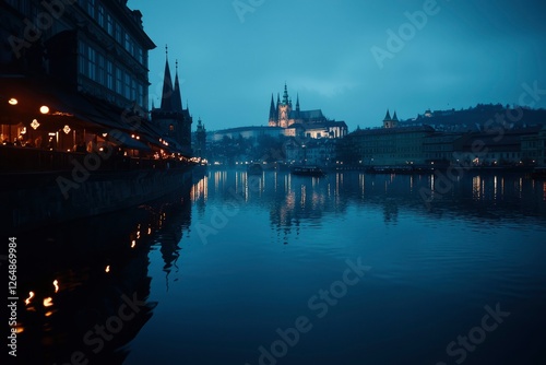 Naklejka premium Cityscape reflects on river at night. Prague castle in soft focus in background