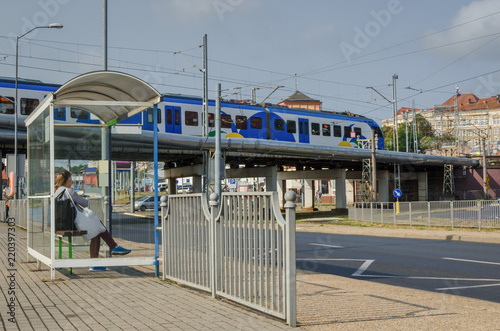 Fototapeta premium CITYSCAPE - Regional train on the viaduct in Szczecin