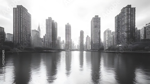 Fototapeta premium Cityscape, river reflection, urban, grayscale, morning mist, calm, skyscrapers, architecture, tranquil, design