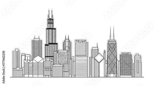 Naklejka premium Cityscape Silhouette: A detailed pen and ink style line drawing showcases the iconic skyline, a celebration of urban design.