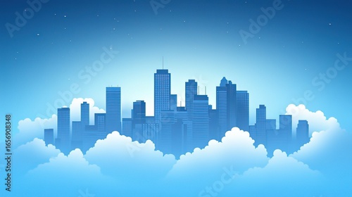 Obraz premium Cityscape Silhouette Above Clouds with Star - filled Sky in Blue Tones