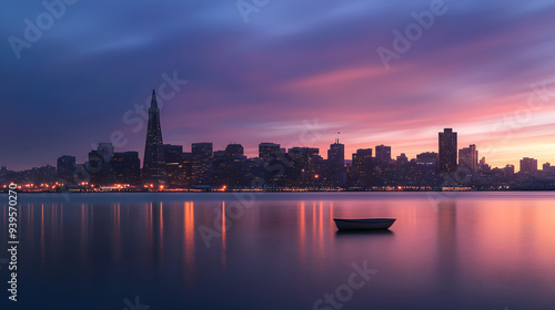© JADE, Fototapeta premium Cityscape silhouette against a fiery sunset, reflecting in calm water