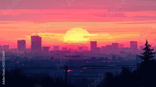 © Penatic Studio, Fototapeta premium Cityscape silhouette against a vibrant sunset sky backdrop