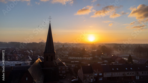 © Bjorn B, Fototapeta premium Cityscape silhouette of catholic church tower in Sint Jozef, Rijkevorsel, Belgium on a wonderful orange blue evening sky background. Cityscapes and religion concepts. High quality photo