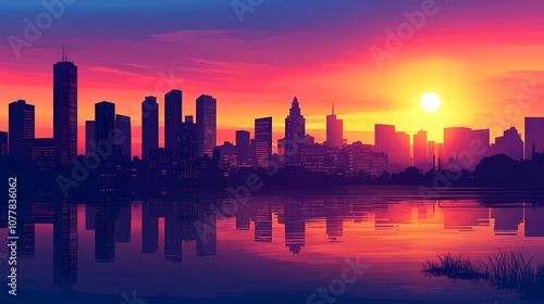 © Genta, Fototapeta premium Cityscape silhouette reflected in water at sunset.