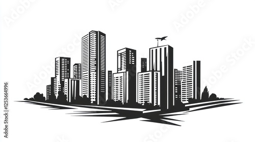 Fototapeta premium Cityscape silhouette, urban buildings, horizon, background plane, graphic...