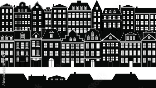 Obraz premiumCityscape silhouette vector, urban buildings, architectural design, skyline illustration, black icon, window detail, rooftop shape, downtown sketch, modern structure, street view