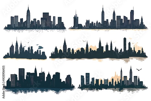 © Snigdha, Fototapeta premium Cityscape silhouettes collection of urban skylines with architectural landmarks and city views