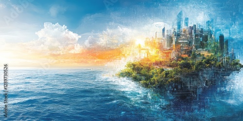 © Basileus, Obraz premium Cityscape sits atop lush land surrounded by ocean waters
