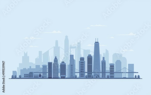 Naklejka premium Cityscape skyline. Modern city skyline silhouette with skyscrapers, bridge and cloudy sky. Represents growth, progress, and urbanization.