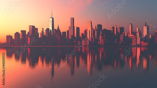 © sungedi, Fototapeta premium Cityscape Skyline Reflected in Still Water at Sunset