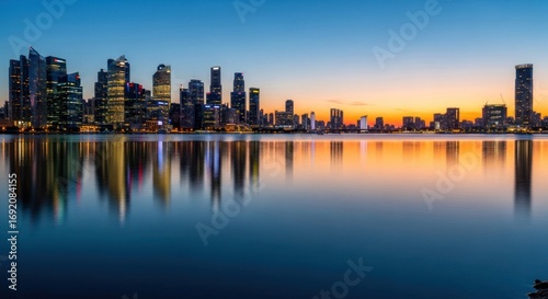 © MuhammadArsya, Fototapeta premium Cityscape Skyline Reflection at Sunset Over Calm Water.
