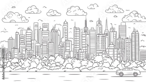 Naklejka premium Cityscape Skyline With Car And Lush Greenery