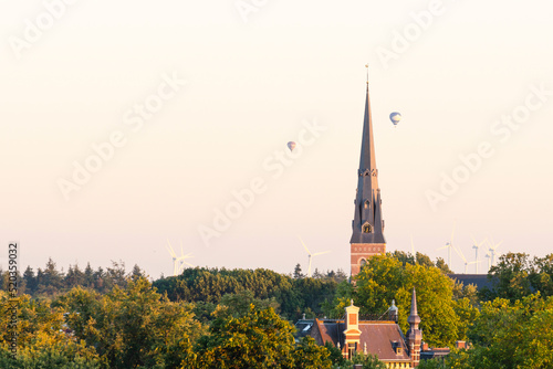 Fototapeta premium Cityscape small northern european city. European cathedral tower surrounded by green trees at sunset with hot air balloons. Breda, the netherlands