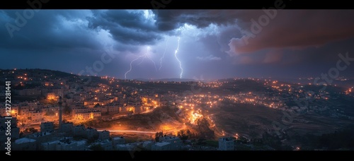 © artwiyanastudio, Obraz premium Cityscape Stormy Night Lightning Jerusalem