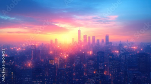 © RONNY, Obraz premium Cityscape sunrise, hazy dawn, urban glow, website banner