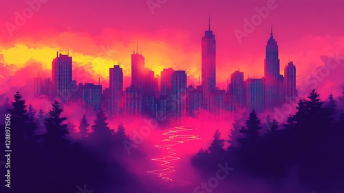 Fototapeta premium Cityscape Sunrise, Misty Forest, River
