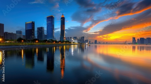 © Chananphat, Fototapeta premium Cityscape Sunrise Reflection