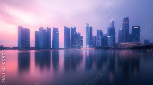 © lestari, Fototapeta premium Cityscape sunrise reflection, harbor, buildings, dawn, urban, Asia, skyline, tranquil