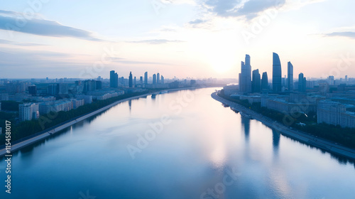 © Lailatul, Fototapeta premium Cityscape Sunrise River Reflection Aerial View.