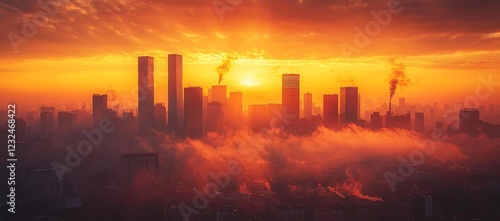 Fototapeta premium Cityscape sunrise, smog, pollution, urban, skyline, sunrise, dramatic,...